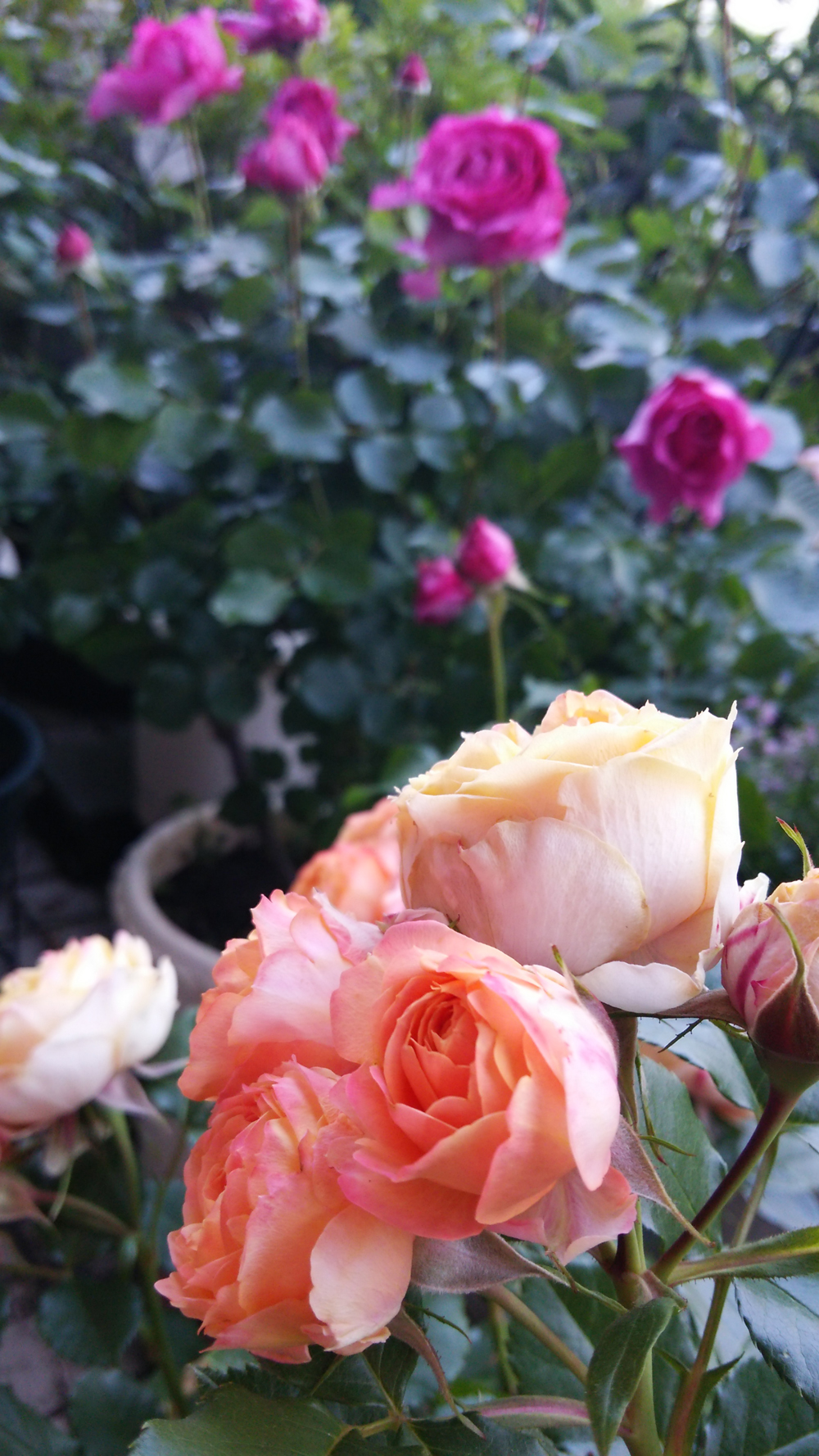 上の写真はジュビリーさんとベビロマさん。この二人は花数多いです。ピエールも多いけど、ピエールさんは春だけですが、この二人は夏と秋も咲いてくれます。夏はちょっと休ませてあげたいなぁ。