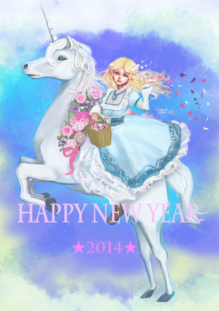 新年の絵に、うちのオリジナルの子のルーチェさんとユニコーンを。