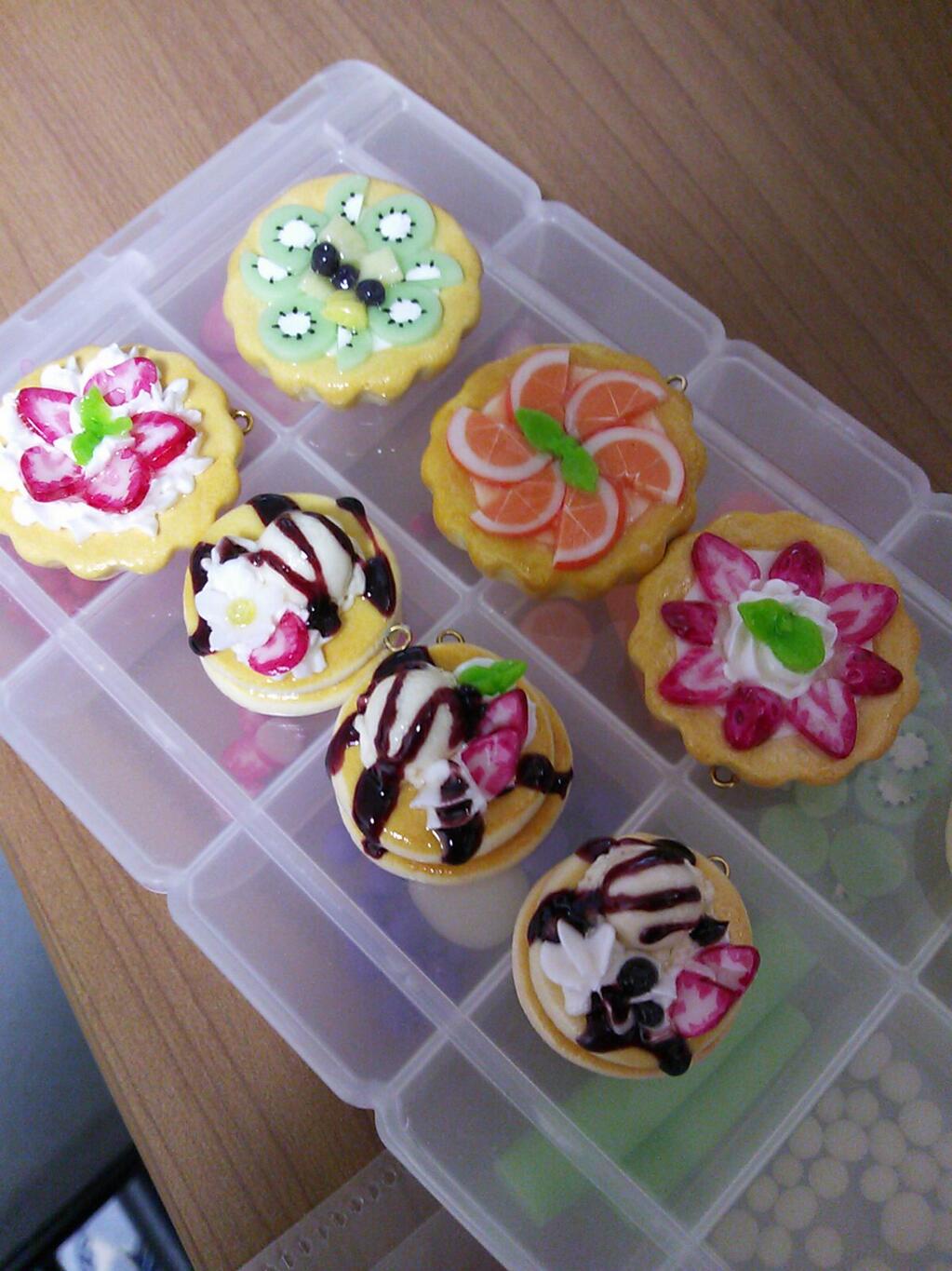 ↑おなじみのホットケーキとタルトは小さなチャームに