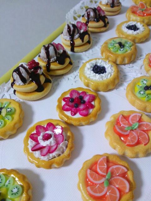 粘土の方ですが、今回はタルトとホットケーキのマグネットを確実に持っていけます(*´∀`*)いちご、オレンジ、キュウイ、ブルーベリーのタルト、アイスの乗ったホットケーキです。