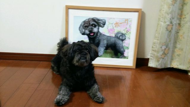 肖像画の作品は許可を頂いて販売しているのですが、私が何も説明していないのに「これ○●君じゃない!?」と気付いてくださるお客様が何人かいらしてビックリ!!!お知り合いのようでした。肖像画を描く時は、ちゃんと「その子」を描けるよう研究しながら描きます。飼い主さまからお聞きした性格やエピソードを思いながら描くのです。なので、飼い主様以外の人にも「○●君だ」と気付いてもらえるのは、一生懸命に描いた成果が出てるのでは~と嬉しいです。゚゚(*´□`*。)°゚。