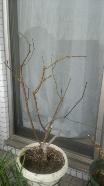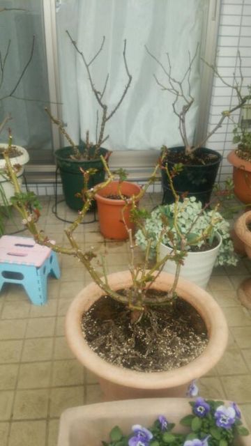 剪定後の現在お姿。エモさまはかなりの横張りのお方なので毎年内芽で切ってこの感じです。株はかなり樹っぽい感じで太くなりました。本当はもっと大きく育てて沢山大きなお花を咲かせるはずです。今はかなり沢山芽が動いているので今年はまた花数が戻るといいなぁ。